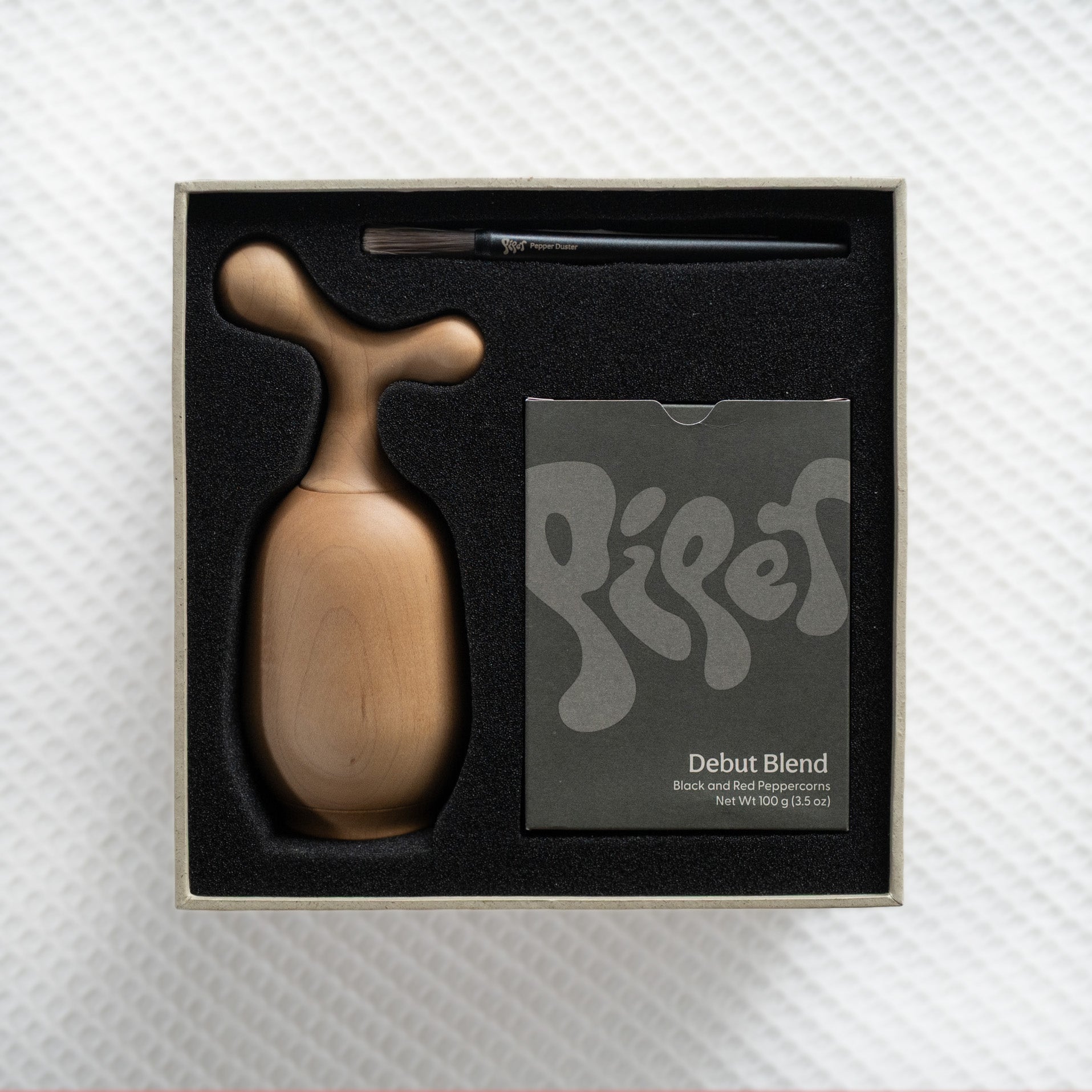 Comes with 100g of our Debut Blend peppercorns and Pepper Duster brush.